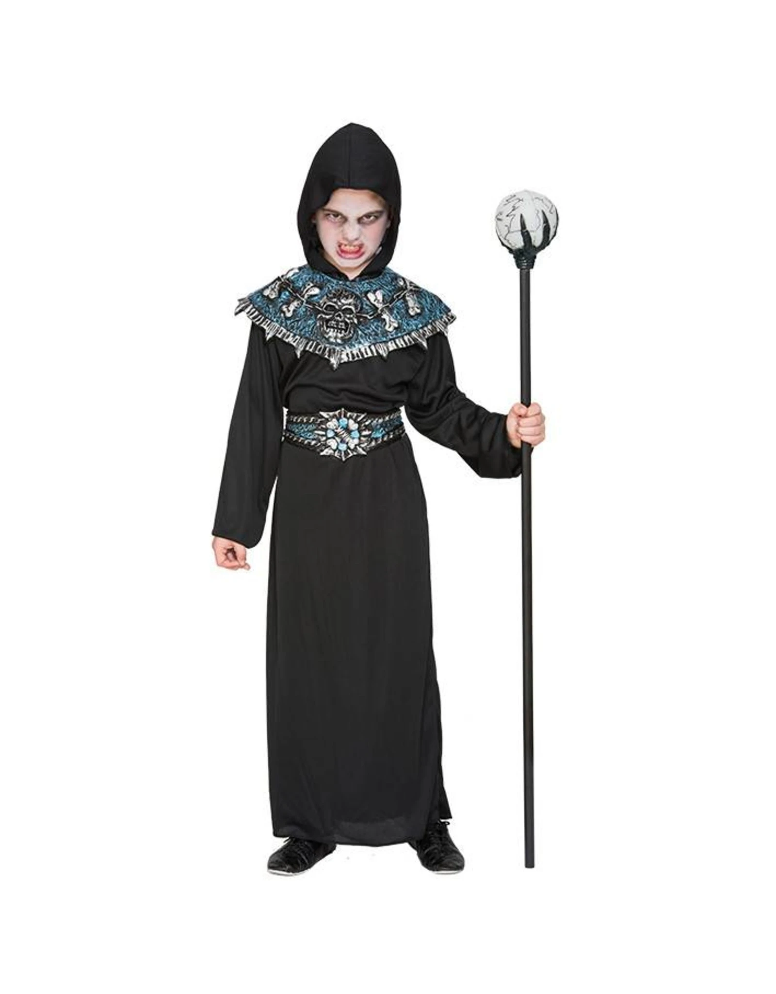 Dit kostuum bestaat uit een gewaad met capuchon, latex skull kraag en riem.
