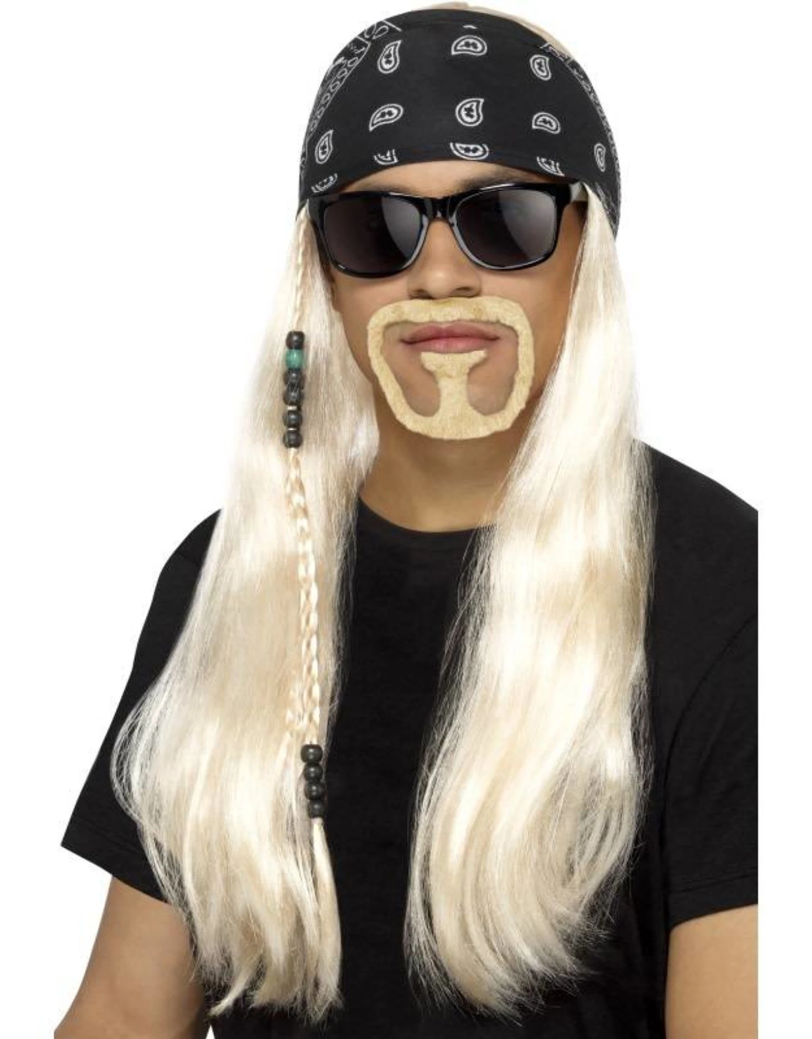 Dit set bestaat uit een pruik, baard met snor, bandana en een bril.