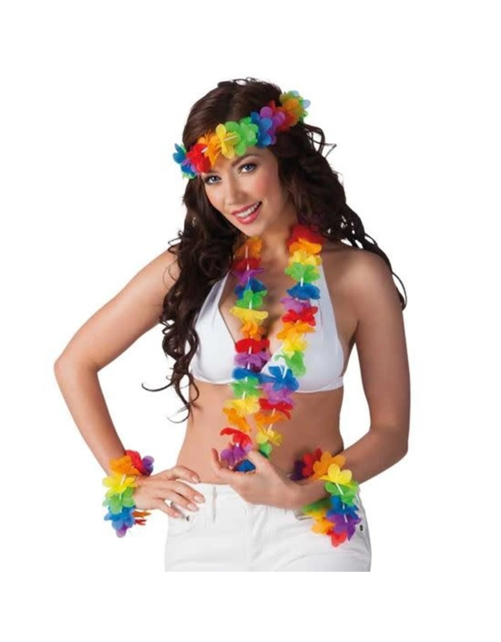 De regenboog Hawaiiset bestaat uit: halsketting, 2 armbanden en hoofdband.
