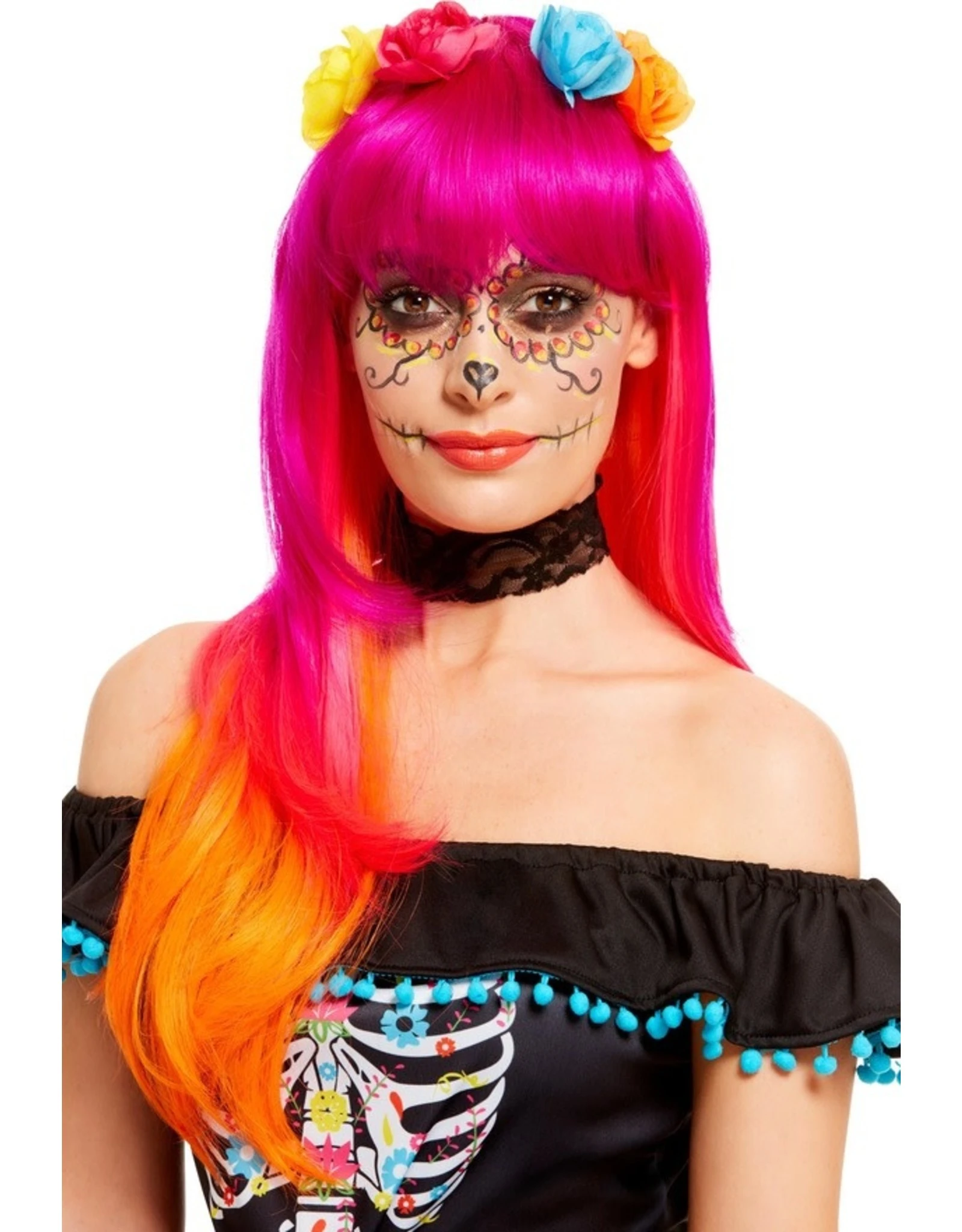 Pruik Deluxe Day Of The Dead, Roze/Oranje
